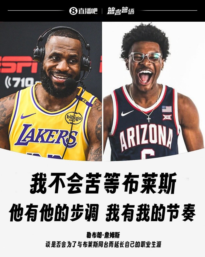 当被问及是否会为了与小儿子布莱斯一起在NBA打球而延长自己的职业生涯时,詹姆斯说道:“我不会苦等布莱斯。我不知道他的时间规划如何,他现在已经是个独立的大小伙子了。至于后续发展,今年也好明年也罢,顺其自然吧。他有他的步调,我有我的节奏——说实在的,这两条时间线未必合拍。”