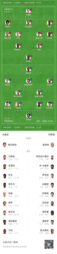 水晶宫首发:1-迪恩-亨德森、2-穆尼奥斯、3-米切尔、5-拉克鲁瓦、6-格伊、26-理查兹、18-镰田大地、20-沃顿、7-伊斯梅拉-萨尔、10-皮诺、14-马特塔